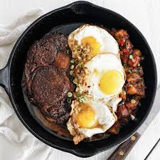 6oz Canadian sirloin steak with eggs, toast and pan-fried potatoes.