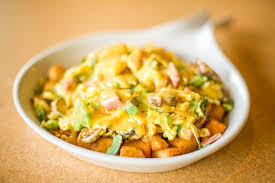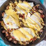 Scrambled eggs, cheese sauce, tomatoes, mushrooms & bacon over hashbrowns.